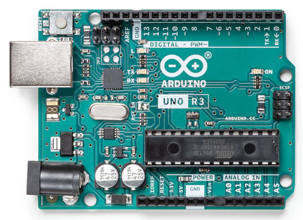 Arduino UNO: The Arduino Uno-board is a 8 bit-microcontroller. It has I/0 pins including both digital and analog pins.