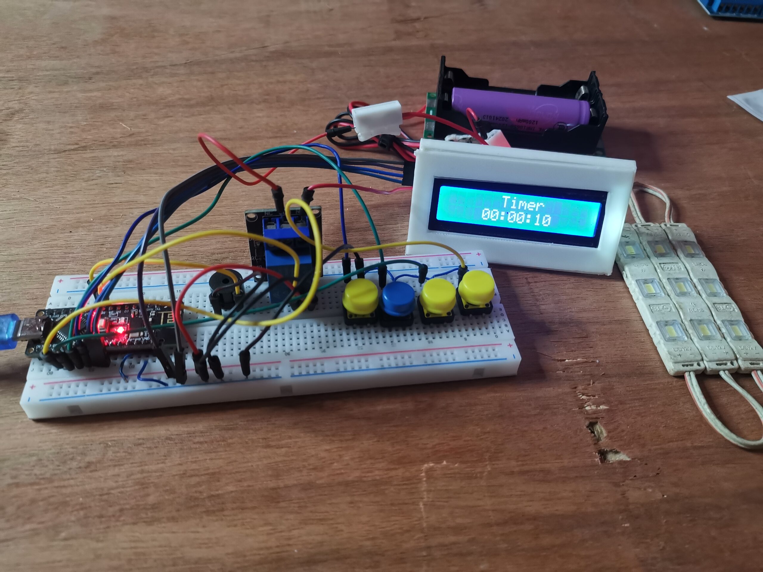 I2C LCD (16×2)Displays the countdown and the setup menu. The I2C module on the back saves you from wiring 12+ pins, reducing it to just 4.