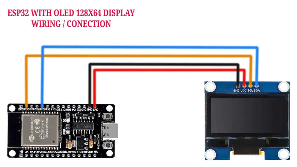 Start by connecting the 128×64 OLED display to the ESP32 NodeMCU. These two components communicate over the I2C protocol, which simplifies the wiring process. Here’s how to connect the display to the ESP32: