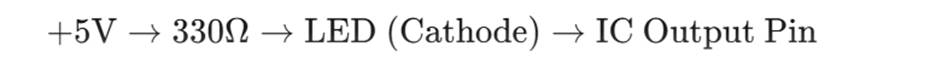 - IC Output = Logic ‘0’ (LOW): The IC sinks current, completing the circuit path for the LED. LED is ON.