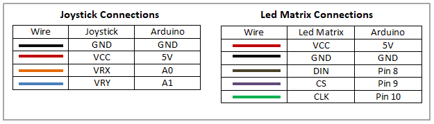 The connections for the Joystick and led matrix are done as shown below.