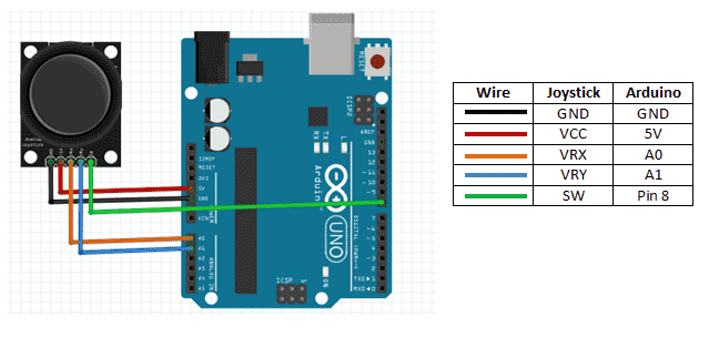 The components are connected as shown in the figure below. +5V pin is connected to the 5V power supply, GND pin is connected to the GND, the VRx and VRy pins are connected to the analog input pins and the SW pin is connected to the digital I/O pin.