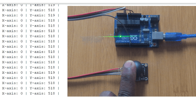 When the above code is uploaded to the Arduino, from the serial monitor we can be able to see the X and Y analog values for the different positions of movement of the joystick.