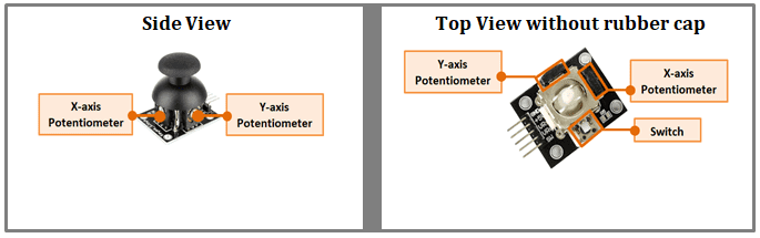 These potentiometers are used as dual adjustable voltage dividers, providing 2-Axis analog input in a control stick form. When at rest,the potentiometers give 2.5V for both X and Y. Moving the joystick will cause the output to vary from 0v to 5V depending on its direction.