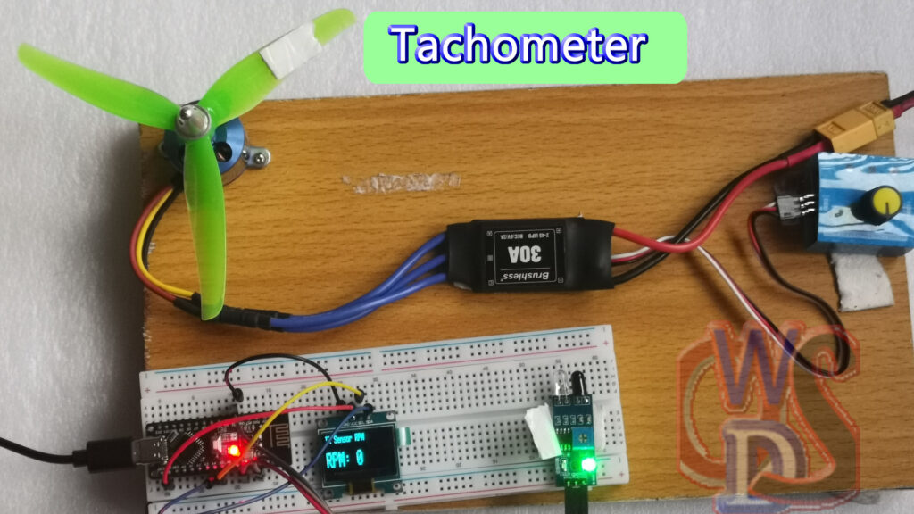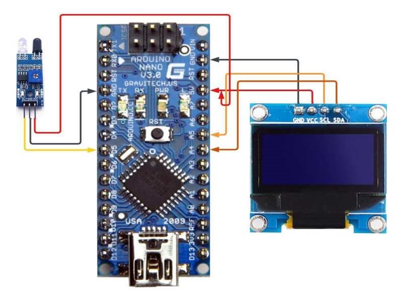 This project is made using an infrared (IR) sensor and an OLED display with Arduino nano board. It counts the revolutions of a rotating object with an infrared (IR) sensor, calculates the RPM (revolutions per minute), and displays the RPM value on an OLED screen.